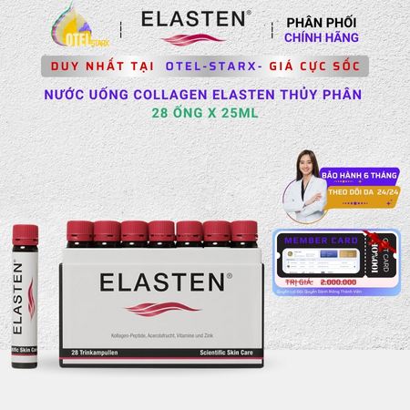 Nước Uống Collagen Elasten Căng Mịn, Ngừa Lão Hoá là sản phẩm hỗ trợ làm đẹp đến từ thương hiệu Elasten – Đức, với công thức [HC] Collagen Complex đột phá, độc quyền, collagen trong ELASTEN được thủy phân thành các phân tử collagen peptide cực nhỏ giúp quá trình hấp thụ vào cơ thể tối ưu, mang lại hiệu quả nhanh hơn collagen thông thường. Đặc biệt collagen gốc bò tương thích tới 90% cấu trúc collagen tự nhiên của con người, phù hợp bổ sung lượng collagen bị thiếu hụt và tăng cường hiệu quả trẻ hóa trên da.