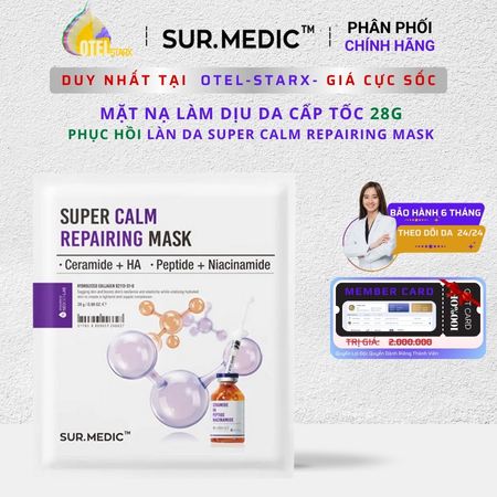 Mặt Nạ Phục Hồi, Làm Dịu Da Cấp Tốc Sur.Medic+ Super Calm Repairing Mask là mặt nạ với phức hợp 5 loại Ceramide, 3 loại HA, 2 loại Peptide và Niacinamide cùng công nghệ Hydrolyzed Collagen tăng cường khả năng hấp thụ dưỡng chất của da giúp phục hồi, làm dịu da tức thì, giảm tình trạng kích ứng, tăng độ đàn hồi, xây dựng hàng rào bảo vệ da vững chắc và cấp ẩm sâu chỉ sau 15 phút mang lại làn da mềm mịn, ẩm mượt thuộc thương hiệu Sur.Medic đến từ Hàn Quốc.
